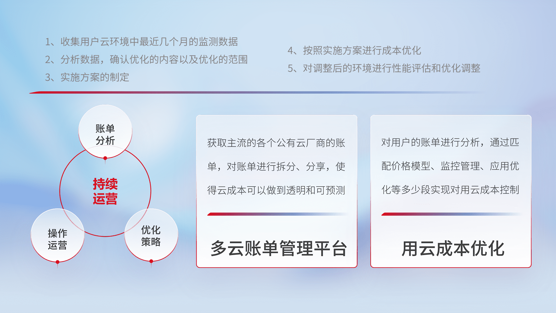 通过多云纳管,,,以统一的资源数据模型把客户的云资源进行抽象和封装,,,进而实现对多云资源的统一操作,,,保障云资源管理的可靠性、、稳定性与可用性。。量身定制化运维内容,,,配置、、、开发运维、、、补丁管理、、备份、、、监控、、、认证和访问管理、、、审计和日常巡检等,,,,保障在用云过程中的可靠度,,,稳定度以及高可用率。。。。