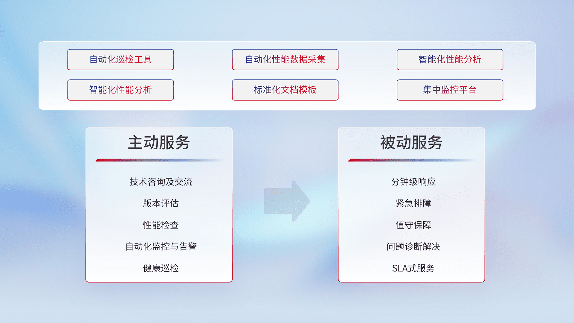 智能化工具和标准化文档,,保障服务质量,,提供主动服务(包含技术咨询、、、版本评估、、性能检查、、、自动化监控与告警、、健康巡检)和被动服务包含(分钟级响应、、紧急排障、、值守保障、、问题诊断解决、、、、SLA服务)。。